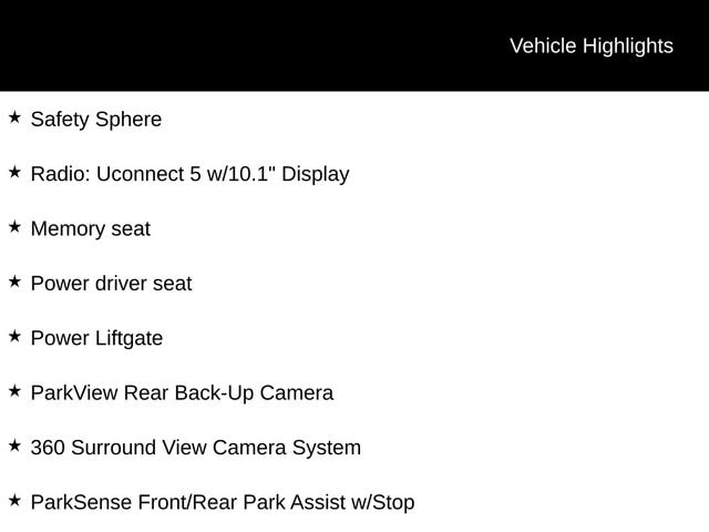 Select, AWD, Safety Sphere, Adaptive Cruise Control, Blind Spot & Rear Cross Path, Lane Departure Warning, Power Liftgate, 18" x 7.5" Painted Aluminum Wheels, 360 Surround View Camera System, Heated steering wheel, Memory seat, ParkSense Front/Rear Park Assist w/Stop, ParkView Rear Back-Up Camera, Power driver seat, Uconnect 5 w/10.1" Display, 18" x 7.5" Painted Aluminum Wheels.