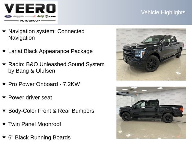 Lariat, 4x4, 3.5L PowerBoost Full-Hybrid V6, Lariat Black Appearance Package, Twin Panel Moonroof, Navigation system: Connected Navigation, 6" Black Running Boards, Pro Power Onboard - 7.2KW, Body-Color Front & Rear Bumpers, Cooled Seats, Electronic Locking w/3.73 Axle Ratio, Heated front seats, Heated steering wheel, Power driver & Passenger seat, B&O Unleashed Sound System by Bang & Olufsen, Wheels: 20" Gloss Black Painted Aluminum.