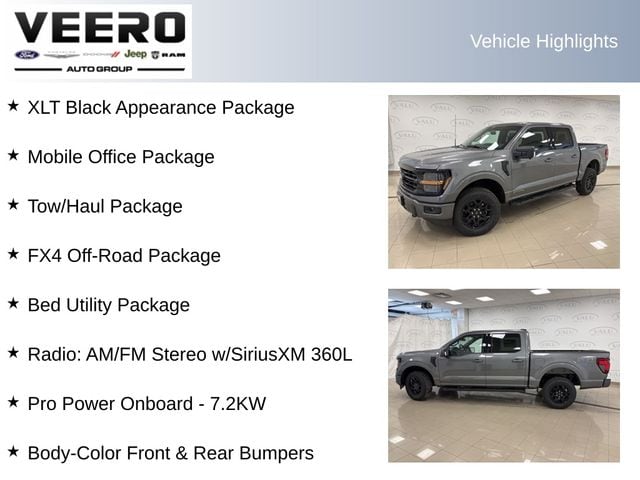XLT, 4x4, XLT Black Appearance Package, Tow/Haul Package, 6" Black Running Boards, Bed Utility Package, FX4 Off-Road Package, Integrated Trailer Brake Controller, LED Box Lighting, Mobile Office Package, Pro Power Onboard - 7.2KW, Body-Color Front & Rear Bumpers, Electronic Locking w/3.73 Axle Ratio, Floor Shifter, Heated Front Seats, AM/FM Stereo w/SiriusXM 360L, Remote Start System w/Remote Tailgate Release, SecuriCode Keyless-Entry Keypad, Tailgate Step w/Tailgate Work Surface, Unique Sport Cloth 40/Console/40 Front-Seats, Wheels: 18" Gloss Black.