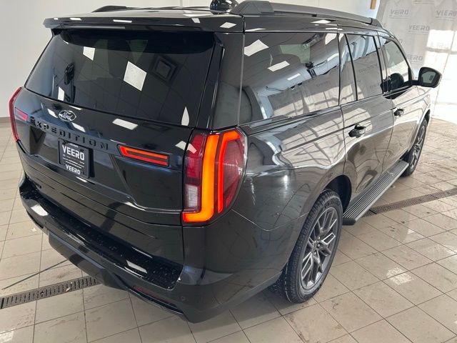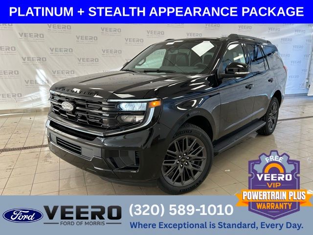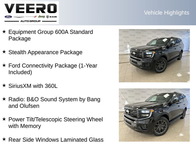2nd Row Power-Folding Captain's Chairs, 3.73 Axle Ratio, Black Belt Molding, Black Expedition Lettering on Hood, Black Headlamp Bezel with Ebony Trim Applique, Black Platinum Badge on Tailgate, Black Roof Rails, BlueCruise Equipped (90-Day Trial), Carbon Black Front Bumper/Fascia, Equipment Group 600A Standard Package, Ford Connectivity Package (1-Year Included), Ford Digital Experience, Heated and Ventilated Leather Front Captain's Chairs, Heated front seats, Heated rear seats, Power Tilt/Telescopic Steering Wheel with Memory, Radio: B&O Sound System by Bang and Olufsen, Rear Side Windows Laminated Glass, Signature Grille Lighting, SiriusXM with 360L, Stealth Appearance Package, Wheels: 22" x 9.0" Magnetite Painted Aluminum.