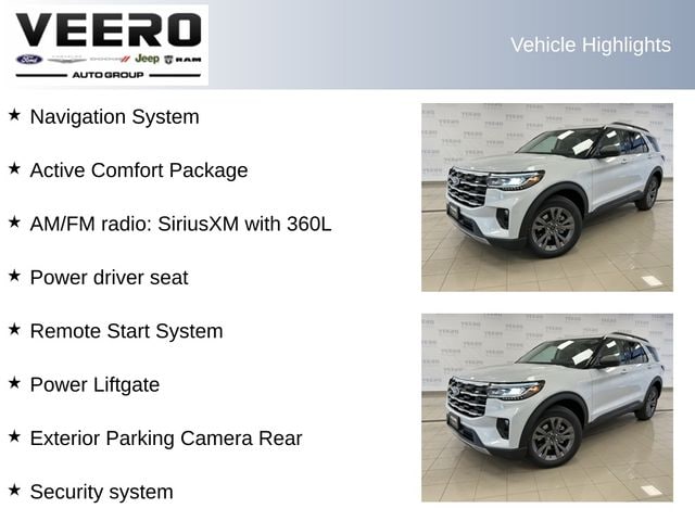 2026 Ford Explorer Active, 4WD, Active Comfort Package, Navigation System, Power Liftgate, Remote Start System, Security system, AM/FM radio: SiriusXM with 360L, Rear View Camera, Heated ActiveX Seating Material Captain's Chairs, Heated Steering Wheel, Power driver seat, Wheels: 20" Carbonized Gray-Painted Aluminum.