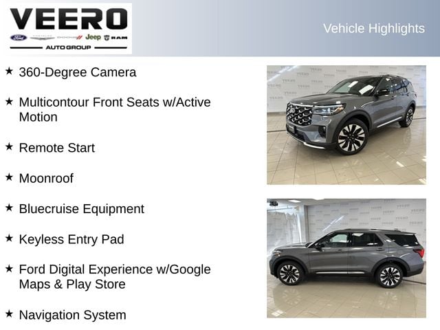 **2026 Ford Explorer Platinum**Carbonized Gray Metallic Exterior**Mohave Dusk Leather Trim Seats**Lux Leather Package**500A Equipment Group**Moonroof**360-Degree Camera**Multicontour Front Seats w/Active Motion**Remote Start**Heated/Cooled Front Seats, Heated Steering Wheel, Heated Rear Seats, Navigation, Bluecruise Equipment, Keyless Entry Pad, Ford Digital Experience w/Google Maps & Play Store, Apple CarPlay/Android Auto, BLIS: Blind Spot Information System, Lane-Keep Assist, Radio: B&O Sound System by Bang & Olufsen w/HD, Rain Sensing Wipers, Power-Folding Memory Door Mirrors, Class III Trailer Tow Package, Wheels: 21" Bright Machined Alum w/Tarnish Dk Pkts.