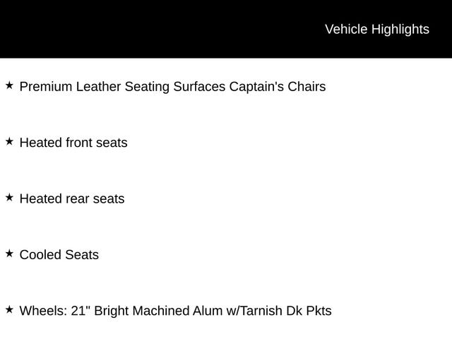 Sales Tax, Title, License Fee, Registration Fee, $350 Dealer Documentary Fee, Finance Charges and Emission Testing Fees (if applicable) are additional to the advertised price. Check out the rest of the features on this vehicle. Lux Leather Package (Premium Leather Seating Surfaces Captain's Chairs, Platinum Badges on Front Row Seats, Quilting & Stitching on Door Panels, and Quilting & Stitching on Seats), Equipment Group 600A Standard Package, 4WD, Cooled Seats, Heated front seats, Heated rear seats, Heated steering wheel, Memory seat, Panoramic Fixed Glass Roof w/Power Shade, Power driver seat, Power Liftgate, Radio: B&O Sound System by Bang & Olufsen w/HD, Splash Guards, Wheels: 21" Bright Machined Alum w/Tarnish Dk Pkts, 14 Speakers, 3rd row seats: bench, 4-Wheel Disc Brakes, ABS brakes, ActiveX Trimmed Captain's Chairs, Air Conditioning, AM/FM radio: SiriusXM with 360L, Apple CarPlay/Android Auto, Auto High-beam Headlights, Auto-dimming door mirrors, Auto-dimming Rear-View mirror, Automatic temperature control, Brake assist, Bumpers: body-color, Compass, Delay-off headlights, Driver door bin, Driver vanity mirror, Dual front impact airbags, Dual front side impact airbags, Electronic Stability Control, Emergency communication system: 911 Assist, Engine Block Heater, Exterior Parking Camera Rear, Four wheel independent suspension, Front anti-roll bar, Front Bucket Seats, Front Center Armrest, Front dual zone A/C, Front fog lights, Front reading lights, Fully automatic headlights, Garage door transmitter, Heated door mirrors, Illuminated entry, Knee airbag, Leather steering wheel, Low tire pressure warning, Navigation System, Occupant sensing airbag, Outside temperature display, Overhead airbag, Overhead console, Panic alarm, Passenger door bin, Passenger vanity mirror, Power door mirrors, Power passenger seat, Power steering, Power windows, Radio data system, Rain sensing wipers, Rear air conditioning, Rear anti-roll bar, Rear reading lights, Rear window defroster, Rear window wiper, Remote Keyless Entry, Security system, Speed control, Speed-sensing steering, Speed-Sensitive Wipers, Split folding rear seat, Spoiler, Steering wheel mounted audio controls, Tachometer, Telescoping steering wheel, Tilt steering wheel, Traction control, Trip computer, Turn signal indicator mirrors, and Variably intermittent wipers.