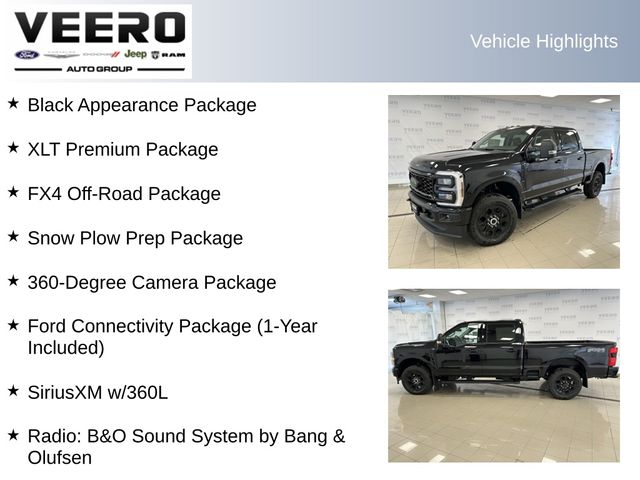 XLT, 4x4, Black Appearance Package, XLT Premium Package, FX4 Off-Road Package, 360-Degree Camera Package, 6" Ebony Black Angular Running Boards, BLIS w/Cross-Traffic Alert, Body Color Front & Rear Bumpers, Cloth 40/20/40 Split Bench Seat, Electronic-Locking w/3.73 Axle Ratio, Rear View Camera, Ford Connectivity Package (1-Year Included), Heated Front Seats, LED Box Lighting, LED Center High-Mounted Stop Lamp (CHMSL) Camera, Off-Road Specifically Tuned Shock Absorbers, PowerScope Trailer Tow Mirrors w/Heat, B&O Sound System by Bang & Olufsen, Rear Parking Sensors, Rear Wheel Well Liners, Remote Start System, SiriusXM w/360L, Snow Plow Prep Package, Tough Bed Spray-In Bedliner, Upfitter Switches (6), Wheels: 20" Ebony Black High Gloss.