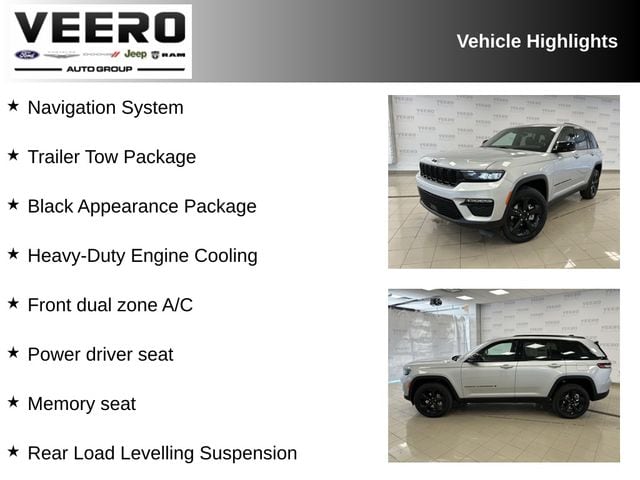 2025 Jeep Grand Cherokee Limited, Black Appearance Package, Trailer Tow Package, Global Black Capri Leatherette Seats, Remote Start, Navigation, Heated Front Seats, Heated Rear Seats, Heated Steering Wheel, Blind Spot w/Cross-Path Detection, Adaptive Cruise Control, Memory Mirrors, Front Dual Zone A/C, Rear View Day/Night Mirror, 8-Way Power Driver & Front Passenger Seats w/Driver Memory, Automatic Headlamp Levelling System, Class IV Receiver Hitch, Garage Door Transmitter, Rear Load Levelling Suspension, Trailer Hitch Zoom, Wheels: 20" x 8.5" Gloss Black Painted Aluminum.