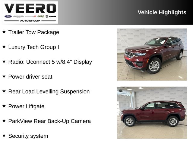 Laredo, 4WD, Luxury Tech Group I, Trailer Tow Package, Class IV Receiver Hitch, Compass, Heated Front Seats, Heated Steering Wheel, Rear Back-Up Camera, Power driver seat, Power Liftgate, Uconnect 5 w/8.4" Display, Rear Load Levelling Suspension, Remote Start System, Security system, Wheels: 17" x 6.5" Fully Painted Aluminum, Wireless Charging Pad.