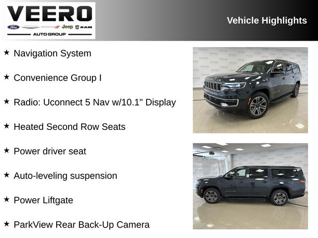 Wagoneer L, 4x4, Navigation System, Auto-leveling suspension, Convenience Group I, Cooled Seats, Heated front seats, Heated Second Row Seats, Heated steering wheel, P&P Park & Unpark Assist w/Stop System, ParkView Rear Back-Up Camera, Power driver seat, Power Liftgate, Power passenger seat, Rack Cargo Management System, Uconnect 5 Nav w/10.1" Display, Security system, Side Distance Warning, Surround View Camera System, Wheels: 20" x 9.0" Premium 2 Aluminum.