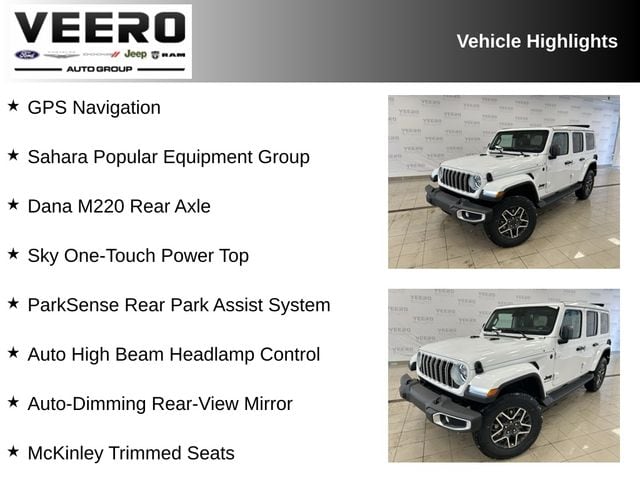 - GPS Navigation, Radio: Uconnect 5 Nav w/12.3" Display, Dana M220 Rear Axle, Sky One-Touch Power Top, Blind Spot & Cross Path Detection, ParkSense Rear Park Assist System, Auto High Beam Headlamp Control, 12.3" Touchscreen Display, Auto-Dimming Rear-View Mirror, McKinley Trimmed Seats, Wheels: 18" x 7.5" Machine/Painted Gray