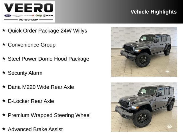 4-Wheel Drive Swing Gate Decal, 4.10 Rear Axle Ratio, 7 and 4 Pin Wiring Harness, Advanced Brake Assist, Automatic Headlamps, Auxiliary Switches, Black Grille with Gloss Black Rings, Class II Receiver Hitch, Cluster 7.0" TFT Color Display, Convenience Group, Conventional Differential Front Axle, Corning Gorilla Glass, Dana M210 Wide HD Tube Front Axle, Dana M220 Wide Rear Axle, Daytime Running Lamps LED Accents, Deep Tint Sunscreen Windows, E-Locker Rear Axle, Emergency/Assistance Call, Enhanced Adaptive Cruise Control, Front LED Fog Lamps, Full Speed Forward Collision Warning Plus, Heated Front Seats, Heated Steering Wheel, Injection Molded Black Rear Bumper, LED Premium Reflector Headlamps, Mold in Color Bumper with Gloss Black, Molded in Color Rubicon Highline Flare, MOPAR All-Weather Floor Mats, Off-Road Plus Mode, Power Dome Dual Vented Hood, Power Heated Mirrors, Premium Wrapped Steering Wheel, Quick Order Package 24W Willys, Security Alarm, Sky One-Touch Power Top, Steel Power Dome Hood Package, Sun Visors with Illuminated Vanity Mirrors, Wheels: 17" x 7.5" Painted Black, Willy's Suspension, Willys Hood Decal.
