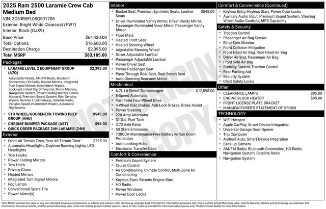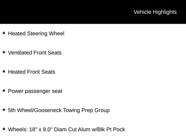 Laramie, 4x4, High Output Turbo Diesel, 5th Wheel/Gooseneck Towing Prep Group, Anti-Spin Differential Rear Axle, Chrome Bumper Package, GPS Navigation, Heated Front & Rear Seats, Heated Steering Wheel, ParkView Rear Back-Up Camera, Power driver & Passenger seat, Ventilated Front Seats, Uconnect 5 Nav w/14.4" Display, Security system, SiriusXM w/360L, Wheels: 18" x 8.0" Diameter Cut Alum w/Blk Pt Pock.