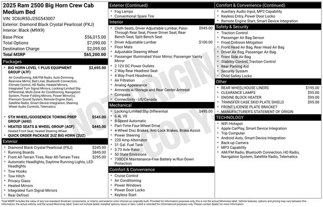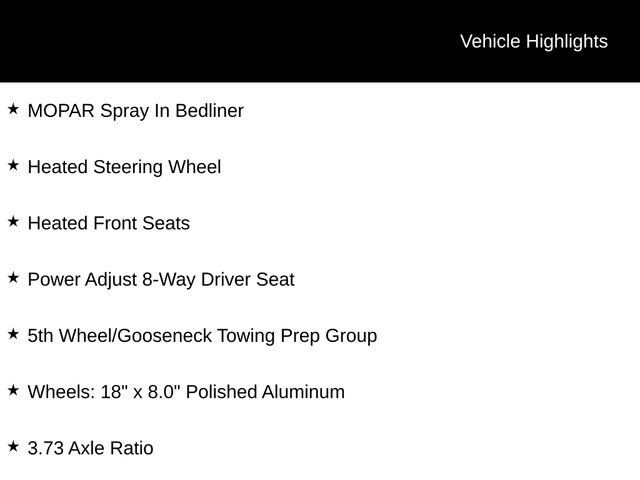 Big Horn, 4x4, 5th Wheel/Gooseneck Towing Prep Group, Chrome Flat Wheel-to-Wheel Side Steps, GPS Navigation, Heated Front Seats, Heated Steering Wheel, MOPAR Spray In Bedliner, ParkView Rear Back-Up Camera, Power Adjust 8-Way Driver Seat, Uconnect 5 Nav w/12.0" Display, Remote Start System, 3:73 Anti-Spin Differential Rear Axle, w/360L, Wheels: 18" x 8.0" Polished Aluminum.