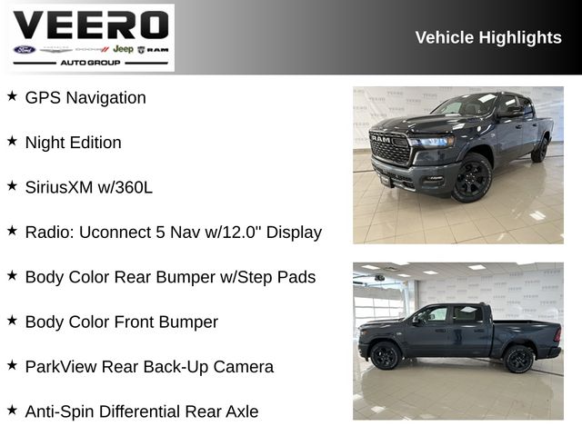 Sales Tax, Title, License Fee, Registration Fee, $350 Dealer Documentary Fee, Finance Charges and Emission Testing Fees (if applicable) are additional to the advertised price. Check out the rest of the features on this vehicle. Night Edition (Anti-Spin Differential Rear Axle, Body Color Front Bumper, Body Color Rear Bumper w/Step Pads, Wheels: 20" x 9.0" Aluminum Painted Clad, Accent Color Door Handles, Accent Color Premium Power Mirrors, Accent Color Tailgate Handle, Auto Power-Folding Mirrors, Auto-Dimming Exterior Driver Mirror, Black Exterior Truck Badging, Black Headlamp Bezels, Black Interior Accents, Black Painted Exterior Mirrors Caps, Black Tail Lamp Bezels, Convex Wide-Angle Exterior Mirror Insert, Dual Exhaust w/Black Tips, Exterior Mirrors Courtesy Lamps, Exterior Mirrors w/Heating Element, Exterior Mirrors w/Supplemental Signals, Grille Black Surround Black Mesh, and RAM Grille Badge - Black), Big Horn Level 2 Equipment Group (GPS Navigation, Heated Front Seats, Heated Steering Wheel, Power Adjust 8-Way Driver Seat, Radio: Uconnect 5 Nav w/12.0" Display, SiriusXM w/360L, 115V Auxiliary Power Outlet, 115V Auxiliary Rear Power Outlet, 12" Touchscreen Display, 2nd Row In Floor Storage Bins, 3 Rear Seat Head Restraints, 4 Way Front Headrests, 400W Inverter, 4G LTE Wi-Fi Hot Spot, 9 Amplified Speakers w/Subwoofer, Air Conditioning ATC w/Dual Zone Control, Apple CarPlay, Auto-Dimming Rear-View Mirror, Black Exterior Mirrors, Black Premium Power Mirrors, Body Color Fender Flares, Bucket Seats, Center Console Parts Module, Cluster 7.0" TFT Color Display, Configurable Drive Mode, Connected Travel & Traffic Services, Connectivity - US/Canada, Deluxe Cloth Bucket Seats, Disassociated Touchscreen Display, Front Seat Back Map Pockets, Full Length Floor Console, Global Telematics Box Module (TBM), Glove Box Lamp, Google Android Auto, GPS Antenna Input, HD Radio, Integrated Center Stack Radio, Integrated Voice Command w/Bluetooth, Leather Wrapped Steering Wheel, LED Dome Lamp w/On/Off Switch, LED Footwell Lighting, Manual Adjust 4-Way Front Passenger Seat, Media Hub w/2 Charge Only USBs, Overhead LED Lamps, Power 2-Way Driver Lumbar Adjust, Power Adjustable Pedals, Premium Overhead Console, Rear 60/40 Folding Seat, Rear Center Armrest, Rear Power Sliding Window, Rear Window Defroster, Remote Tailgate Release, Security Alarm, SiriusXM Radio Service, Steering Wheel Mounted Audio Controls, Sun Visors w/Illuminated Vanity Mirrors, Universal Garage Door Opener, and USB Host Flip), Quick Order Package 27Z Big Horn, 3.92 Rear Axle Ratio, ParkView Rear Back-Up Camera, 33 Gallon Fuel Tank, 4-Wheel Disc Brakes, 48V Belt Starter Generator, 6 Speakers, ABS brakes, Air Conditioning, AM/FM radio, Apple CarPlay/Android Auto, Auto High-beam Headlights, Brake assist, Bumpers: chrome, Cloth Bucket Seats, Cluster 12" TFT Color Display, Compass, Delay-off headlights, Driver door bin, Dual front impact airbags, Dual front side impact airbags, Electronic Stability Control, Front anti-roll bar, Front Bucket Seats, Front Center Armrest w/Storage, Front fog lights, Front License Plate Bracket, Front reading lights, Front wheel independent suspension, Fully automatic headlights, Heated door mirrors, Illuminated entry, Low tire pressure warning, Manual Adjust 4-Way Driver Seat, Manual Folding Exterior Mirrors, Manufacturer's Statement of Origin, MyFlexCare Service Plan, Occupant sensing airbag, Outside temperature Price includes: $2000 - 2026 National Holiday Select Inventory Bonus Cash. Exp. 01/05/2026 $3500 - 2026 National Retail Consumer Cash . Exp. 01/05/2026