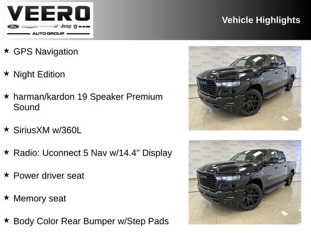 Sales Tax, Title, License Fee, Registration Fee, $350 Dealer Documentary Fee, Finance Charges and Emission Testing Fees (if applicable) are additional to the advertised price. Check out the rest of the features on this vehicle. Night Edition (Anti-Spin Differential Rear Axle, Body Color Front Bumper, Body Color Rear Bumper w/Step Pads, Sport Performance Hood, Wheels: 22" x 9" Forged Aluminum, Accent Color Door Handles, Accent Color Premium Power Mirrors, Accent Color Tailgate Handle, Auto Power-Folding Mirrors, Auto-Dimming Exterior Driver Mirror, Black Exterior Truck Badging, Black Headlamp Bezels, Black Interior Accents, Black Painted Exterior Mirrors Caps, Black Tail Lamp Bezels, Convex Wide-Angle Exterior Mirror Insert, Dual Exhaust w/Black Tips, Exterior Mirrors Approach Lamps, Exterior Mirrors Courtesy Lamps, Exterior Mirrors w/Heating Element, Exterior Mirrors w/Memory, Exterior Mirrors w/Supplemental Signals, Grille Surround 3 Black Texture 2 Black, Pirelli Brand Tires, Proximity Approach/Departure Lamps, and RAM Grille Badge - Black), Laramie Level 2 Equipment Group (GPS Navigation, harman/kardon 19 Speaker Premium Sound, Power Tailgate, Radio: Uconnect 5 Nav w/14.4" Display, SiriusXM w/360L, 14.4" Touchscreen Display, 4G LTE Wi-Fi Hot Spot, Cluster 12" TFT Color Display, Connected Travel & Traffic Services, Connectivity - US/Canada, Front Passenger Interactive Display, Integrated Center Stack Radio, Integrated Voice Command w/Bluetooth, Rain Sensitive Windshield Wipers, SiriusXM Radio Service, and USB Host Flip), Quick Order Package 27H Laramie, 3.92 Rear Axle Ratio, Cooled Seats, Dual-Pane Panoramic Sunroof, Heated front seats, Heated rear seats, Heated steering wheel, Memory seat, Mopar Black Tubular Side Steps, ParkView Rear Back-Up Camera, Power driver seat, Power passenger seat, Security system, Trailer Brake Control, 10 Speakers, 33 Gallon Fuel Tank, 4-Wheel Disc Brakes, ABS brakes, Active Noise Control System, Air Conditioning, AM/FM radio: SiriusXM with 360L, Apple CarPlay/Android Auto, Audio memory, Auto High-beam Headlights, Auto-dimming door mirrors, Auto-dimming Rear-View mirror, Automatic temperature control, Brake assist, Bumpers: chrome, Chrome Exterior Mirrors, Compass, Delay-off headlights, Dome Dual LED Reading Lamp, Driver door bin, Driver vanity mirror, Dual front impact airbags, Dual front side impact airbags, Electronic Stability Control, Engine Block Heater, Front anti-roll bar, Front Bucket Seats, Front Center Armrest w/Storage, Front dual zone A/C, Front fog lights, Front License Plate Bracket, Front reading lights, Front wheel independent suspension, Fully automatic headlights, Garage door transmitter, Heated door mirrors, Illuminated entry, Leather steering wheel, Leather Trimmed Bucket Seats, LED Dome/Reading Lamp, Low tire pressure warning, Manufacturer's Statement of Origin, Navigation System, Occupant sensing airbag, Off-Road Information Pages, Outside temperature display, Overhead airbag, Overhead console, Panic alarm, Passenger door bin, Passenger vanity mirror, Power door mirrors, Power steering, Power windows, Radio data system, Radio: Uconnect 5 Nav w/12.0" Display, RAM Grille Badge - Chrome, Rear anti-roll bar, Rear reading lights, Rear seat center armrest, Rear step bumper, Remote Keyless Entr Price includes: $3500 - 2026 National Retail Consumer Cash . Exp. 01/05/2026