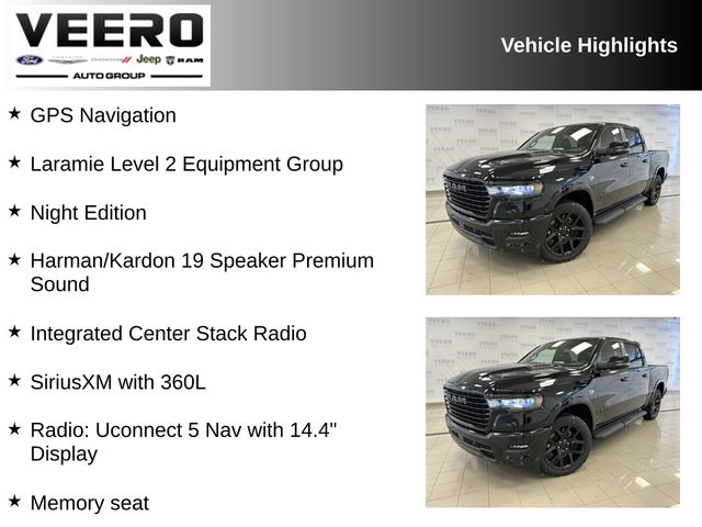14.4" Touchscreen Display, 3.92 Rear Axle Ratio, 33 Gallon Fuel Tank, 4G LTE Wi-Fi Hot Spot, Anti-Spin Differential Rear Axle, Body Color Front Bumper, Cluster 12" TFT Color Display, Connected Travel and Traffic Services, Connectivity - US/Canada, Cooled Seats, Dual-Pane Panoramic Sunroof, Front Passenger Interactive Display, GPS Navigation, Harman/Kardon 19 Speaker Premium Sound, Heated front seats, Heated rear seats, Heated steering wheel, Integrated Center Stack Radio, Integrated Voice Command with Bluetooth, Laramie Level 2 Equipment Group, Memory seat, Mopar Black Tubular Side Steps, Night Edition, ParkView Rear Back-Up Camera, Power driver seat, Power passenger seat, Power Tailgate, Radio: Uconnect 5 Nav with 14.4" Display, Rain Sensitive Windshield Wipers, Security system, SiriusXM Radio Service, SiriusXM with 360L, Sport Performance Hood, Trailer Brake Control, USB Host Flip, Wheels: 22" x 9" Forged Aluminum.