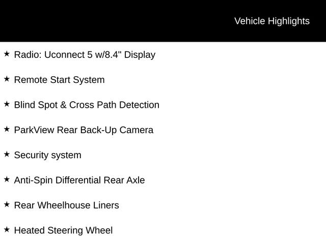 Big Horn, 4x4, Remote Start System, 3.73 Anti-Spin Differential Rear Axle, Blind Spot & Cross Path Detection, Heated Front Seats, Heated Steering Wheel, ParkView Rear Back-Up Camera, Power Adjust 8-Way Driver Seat, Uconnect 5 w/8.4" Display, Rear Wheelhouse Liners, Security system, Wheels: 18" x 8.0" Polished Aluminum.