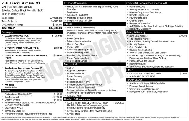 Veero Ford & CDJR of Morris is honored to offer this gorgeous-looking 2010 Buick LaCrosse CXL in Carbon Black Metallic, beautifully equipped with Comfort & Convenience Package #2 (Memory Settings, Outside Heated Power-Adjustable Mirrors, and Ultrasonic Rear Parking Assist), Entertainment Package (120-Volt Power Outlet, harman/kardon 11-Speaker 5.1 Matrix Surround System, and USB Port), Luxury Package (E-Z Key Passive Entry System, Keyless Start Switch, Perforated Leather Appointed Seat Trim, Power Rear Sunshade, Ventilated Driver Seat, Ventilated Passenger Seat, and Wood Grain & Leather Heated Steering Wheel), 3.0L V6 SIDI DOHC VVT, 18" Chrome-Plated Wheels, 18" Painted Machined-Faced Alloy Wheels, 4-Wheel Disc Brakes, 7 Speakers, ABS brakes, Air Conditioning, Alloy wheels, AM/FM radio: XM, AM/FM w/Single CD/DVD Player & Navigation, Auto-dimming Rear-View mirror, Automatic temperature control, Bodyside moldings, Brake assist, Bumpers: body-color, CD player, Compass, Delay-off headlights, Driver door bin, Driver vanity mirror, Dual front impact airbags, Dual front side impact airbags, Electronic Stability Control, Emergency communication system: OnStar Directions & Connections, Four wheel independent suspension, Front anti-roll bar, Front Bucket Seats, Front Center Armrest w/Storage, Front dual zone A/C, Front fog lights, Front License Plate Bracket, Front reading lights, Fully automatic headlights, Garage door transmitter, Heated door mirrors, Heated Front Bucket Seats, Heated front seats, Illuminated entry, Leather Appointed Seat Trim, Low tire pressure warning, Occupant sensing airbag, Outside temperature display, Overhead airbag, Oversized Power Sunroof, Panic alarm, Passenger door bin, Passenger vanity mirror, Power door mirrors, Power driver seat, Power passenger seat, Power steering, Power windows, Radio data system, Radio: AM/FM w/Single CD/MP3 Player, Rear anti-roll bar, Rear reading lights, Rear seat center armrest, Rear window defroster, Rear-View Camera System, Remote Keyless Entry, Security system, Side Blind Zone Alert, Speed control, Speed-sensing steering, Split folding rear seat, Steering wheel mounted audio controls, Tachometer, Telescoping steering wheel, Tilt steering wheel, Traction control, Trip computer, Turn signal indicator mirrors, Variably intermittent wipers, Voltmeter, and XM Radio. Sales Tax, Title, License Fee, Registration Fee, $350 Dealer Documentary Fee, Finance Charges and Emission Testing Fees (if applicable) are additional to the advertised price. Check out the rest of the features on this vehicle. Comfort & Convenience Package #2 (Memory Settings, Outside Heated Power-Adjustable Mirrors, and Ultrasonic Rear Parking Assist), Entertainment Package (120-Volt Power Outlet, harman/kardon 11-Speaker 5.1 Matrix Surround System, and USB Port), Luxury Package (E-Z Key Passive Entry System, Keyless Start Switch, Perforated Leather Appointed Seat Trim, Power Rear Sunshade, Ventilated Driver Seat, Ventilated Passenger Seat, and Wood Grain & Leather Heated Steering Wheel), 3.0L V6 SIDI DOHC VVT, 18" Chrome-Plated Wheels, 18" Painted Machined-Faced Alloy Wheels, 4-Wheel Disc Brakes, 7 Speakers, ABS brakes, Air Conditioning, Alloy wheels, AM/FM radio: XM, AM/FM w/Single CD/DVD Player & Navigation, Auto-dimming Rear-View mirror, Automatic temperature control, Bodyside moldings, Brake assist, Bumpers: body-color, CD player, Compass, Delay-off headlights, Driver door bin, Driver vanity mirror, Dual front impact airbags, Dual front side impact airbags, Electronic Stability Control, Emergency communication system: OnStar Directions & Connections, Four wheel independent suspension, Front anti-roll bar, Front Bucket Seats, Front Center Armrest w/Storage, Front dual zone A/C, Front fog lights, Front License Plate Bracket, Front reading lights, Fully automatic headlights, Garage door transmitter, Heated door mirrors, Heated Front Bucket Seats, Hea