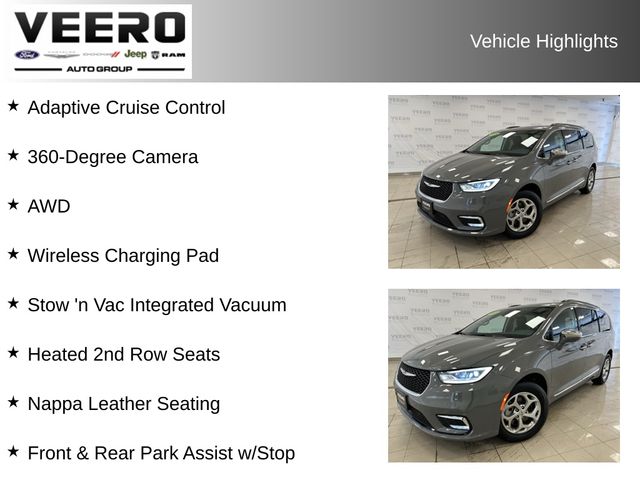 Boasting a stunning Ceramic Gray exterior and a meticulously crafted interior, the Pacifica Limited sets a new standard in the segment. Indulge in the convenience of all-wheel drive, wireless charging, and the Stow 'n Vac integrated vacuum system. Pamper your passengers with heated second-row seats, Nappa leather seating, and a host of advanced safety features, including Adaptive Cruise Control and Parallel & Perpendicular Park-Assist.