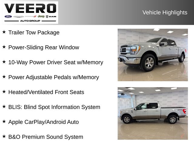 **Clean CARFAX**1-Owner**SuperCrew**Trailer Tow Package**Leather Front Bucket Seats**Heated/Ventilated Front Seats**Navigation**10-Way Power Driver Seat w/Memory**Power Adjustable Pedals w/Memory**Power-Sliding Rear Window**BLIS: Blind Spot Information System**Lane-Keeping System**Reverse Sensing Aid, SYNC 4 w/12" Touchscreen, Apple CarPlay/Android Auto, B&O Premium Sound System, 6" Bright Polished Running Board, BoxLink, Class IV Trailer Hitch Receiver, Backup Camera, Front Dual Zone A/C, Integrated Trailer Brake Controller, LED Box Lighting, Power Tailgate, Pro Trailer Backup Assist, Tailgate Step w/Tailgate Work Surface, Universal Garage Door Opener, Bed Utility Package, 501A Mid Package, Chrome Appearance Package, Wheels: 18" Chrome-Like PVD.