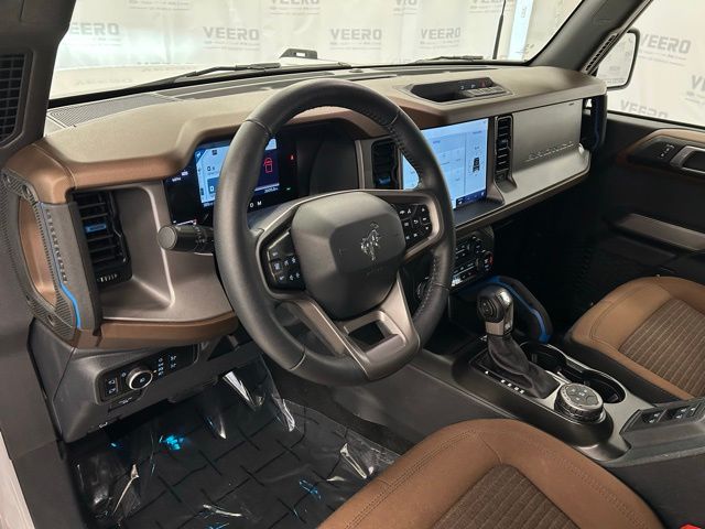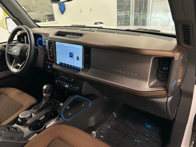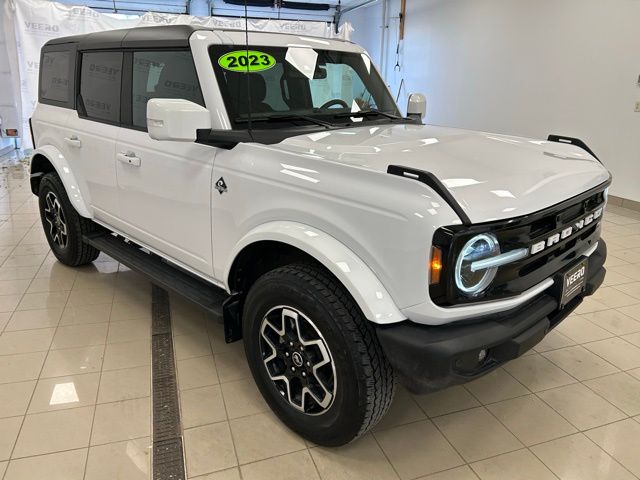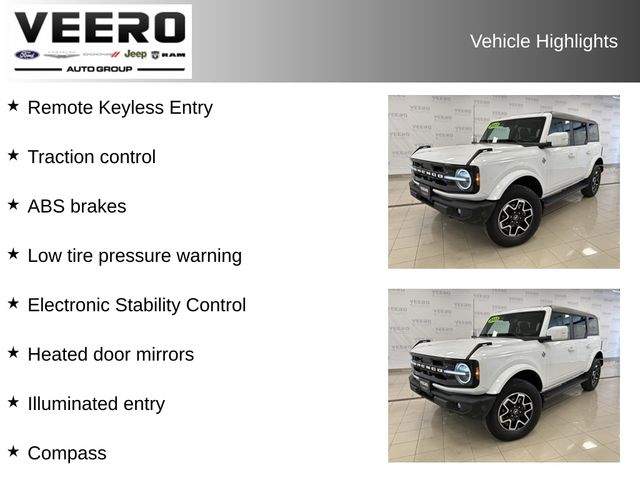 Veero Ford & CDJR of Morris is excited to offer this charming 2023 Ford Bronco Outer Banks in Oxford White, beautifully equipped with ABS brakes, Compass, Electronic Stability Control, Heated door mirrors, Illuminated entry, Low tire pressure warning, Remote Keyless Entry, Traction control, 4-Wheel Disc Brakes, 7 Speakers, Air Conditioning, AM/FM radio: SiriusXM with 360L, AM/FM Stereo, Auto High-beam Headlights, Brake assist, Delay-off headlights, Driver door bin, Driver vanity mirror, Dual front impact airbags, Dual front side impact airbags, Emergency communication system: 911 Assist, Exterior Parking Camera Rear, Front anti-roll bar, Front Bucket Seats, Front Center Armrest, Front reading lights, Front wheel independent suspension, Fully automatic headlights, Integrated roll-over protection, Occupant sensing airbag, Outside temperature display, Overhead airbag, Overhead console, Panic alarm, Passenger door bin, Passenger vanity mirror, Power door mirrors, Power steering, Power windows, Radio data system, Security system, SiriusXM Radio w/360L, Speed control, Split folding rear seat, Steering wheel mounted audio controls, SYNC 4, Tachometer, Telescoping steering wheel, Tilt steering wheel, Trip computer, and Variably intermittent wipers. Sales Tax, Title, License Fee, Registration Fee, $350 Dealer Documentary Fee, Finance Charges and Emission Testing Fees (if applicable) are additional to the advertised price. Check out the rest of the features on this vehicle. ABS brakes, Compass, Electronic Stability Control, Heated door mirrors, Illuminated entry, Low tire pressure warning, Remote Keyless Entry, Traction control, 4-Wheel Disc Brakes, 7 Speakers, Air Conditioning, AM/FM radio: SiriusXM with 360L, AM/FM Stereo, Auto High-beam Headlights, Brake assist, Delay-off headlights, Driver door bin, Driver vanity mirror, Dual front impact airbags, Dual front side impact airbags, Emergency communication system: 911 Assist, Exterior Parking Camera Rear, Front anti-roll bar, Front Bucket Seats, Front Center Armrest, Front reading lights, Front wheel independent suspension, Fully automatic headlights, Integrated roll-over protection, Occupant sensing airbag, Outside temperature display, Overhead airbag, Overhead console, Panic alarm, Passenger door bin, Passenger vanity mirror, Power door mirrors, Power steering, Power windows, Radio data system, Security system, SiriusXM Radio w/360L, Speed control, Split folding rear seat, Steering wheel mounted audio controls, SYNC 4, Tachometer, Telescoping steering wheel, Tilt steering wheel, Trip computer, and Variably intermittent wipers.