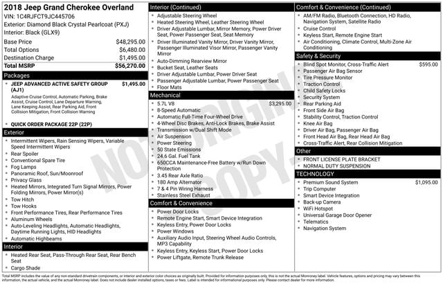 Veero Ford & CDJR of Morris is very proud to offer this stunning 2018 Jeep Grand Cherokee Overland in Diamond Black Crystal Pearlcoat, beautifully equipped with Jeep Advanced Active Safety Group (Adaptive Cruise Control w/Stop, Advanced Brake Assist, Full Speed FWD Collision Warn Plus, Lane Departure Warning Plus, Parallel & Perp Park Assist w/Stop, and Rain Sensitive Windshield Wipers), Quick Order Package 22P, 4WD, 10 Speakers, 19 Speakers High Performance Audio, 4-Wheel Disc Brakes, 7 & 4 Pin Wiring Harness, 825 Watt Amplifier, ABS brakes, Active Noise Control System, Air Conditioning, Alloy wheels, AM/FM radio: SiriusXM, Anti-whiplash front head restraints, Apple CarPlay/Android Auto, Audio memory, Auto High-beam Headlights, Auto-dimming door mirrors, Auto-dimming Rear-View mirror, Auto-leveling suspension, Automatic temperature control, Blind Spot & Cross Path Detection, Brake assist, Bumpers: body-color, Class IV Receiver Hitch, Compass, Cooled Seats, Delay-off headlights, Driver door bin, Driver vanity mirror, Dual Bright Exhaust Tips, Dual front impact airbags, Dual front side impact airbags, Electronic Stability Control, Emergency communication system: SiriusXM Guardian, Engine Oil Cooler, Four wheel independent suspension, Front anti-roll bar, Front Bucket Seats, Front Center Armrest w/Storage, Front dual zone A/C, Front fog lights, Front License Plate Bracket, Front reading lights, Fully automatic headlights, Garage door transmitter, Genuine wood dashboard insert, Heated door mirrors, Heated front seats, Heated rear seats, Heated steering wheel, Heavy-Duty Engine Cooling, High intensity discharge headlights: Bi-Xenon, Illuminated entry, Knee airbag, Leather Shift Knob, Leather steering wheel, Leather Trim Seats w/Edge Welting, Low tire pressure warning, Memory seat, Navigation System, Normal Duty Suspension, Occupant sensing airbag, Outside temperature display, Overhead airbag, Overhead console, Panic alarm, ParkView Rear Back-Up Camera, Passenger door bin, Passenger vanity mirror, Power door mirrors, Power driver seat, Power Liftgate, Power moonroof, Power passenger seat, Power steering, Power windows, Radio data system, Radio: Uconnect 4C Nav w/8.4" Display, Rain sensing wipers, Rear anti-roll bar, Rear reading lights, Rear seat center armrest, Rear window defroster, Rear window wiper, Remote Keyless Entry, Roof rack: rails only, Security system, Speed control, Speed-Sensitive Wipers, Split folding rear seat, Spoiler, Steering wheel mounted audio controls, Tachometer, Telescoping steering wheel, Tilt steering wheel, Traction control, Trip computer, Turn signal indicator mirrors, Variably intermittent wipers, and Wheels: 20" x 8.0" Tech Gray Aluminum. Sales Tax, Title, License Fee, Registration Fee, $350 Dealer Documentary Fee, Finance Charges and Emission Testing Fees (if applicable) are additional to the advertised price. Check out the rest of the features on this vehicle. Jeep Advanced Active Safety Group (Adaptive Cruise Control w/Stop, Advanced Brake Assist, Full Speed FWD Collision Warn Plus, Lane Departure Warning Plus, Parallel & Perp Park Assist w/Stop, and Rain Sensitive Windshield Wipers), Quick Order Package 22P, 4WD, 10 Speakers, 19 Speakers High Performance Audio, 4-Wheel Disc Brakes, 7 & 4 Pin Wiring Harness, 825 Watt Amplifier, ABS brakes, Active Noise Control System, Air Conditioning, Alloy wheels, AM/FM radio: SiriusXM, Anti-whiplash front head restraints, Apple CarPlay/Android Auto, Audio memory, Auto High-beam Headlights, Auto-dimming door mirrors, Auto-dimming Rear-View mirror, Auto-leveling suspension, Automatic temperature control, Blind Spot & Cross Path Detection, Brake assist, Bumpers: body-color, Class IV Receiver Hitch, Compass, Cooled Seats, Delay-off headlights, Driver door bin, Driver vanity mirror, Dual Bright Exhaust Tips, Dual front impact airbags, Dual front side impact airbags, Electronic