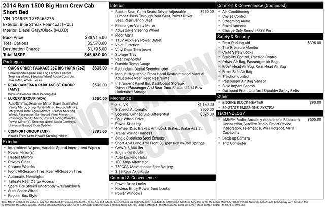 Veero Ford & CDJR of Morris is pumped up to offer this terrific-looking 2014 Ram 1500 Big Horn in Blue Streak Pearlcoat, beautifully equipped with Comfort Group (Heated Front Seats and Heated Steering Wheel), Luxury Group (Ash Tray Lamp, Auto Dim Exterior Mirror, Auto-Dimming Exterior Passenger Mirror, Electroluminescent Instrument Cluster, Exterior Mirrors Courtesy Lamps, Exterior Mirrors w/Supplemental Signals, Glove Box Lamp, Leather Wrapped Steering Wheel, Overhead Console w/Garage Door Opener, Power Folding Mirrors, Power Heated Fold-Away Mirrors, Rear Dome w/On/Off Switch Lamp, Rear-View Auto-Dimming Mirror w/Microphone, Steering Wheel Mounted Audio Controls, Sun Visors w/Illuminated Vanity Mirrors, Underhood Lamp, and Universal Garage Door Opener), Quick Order Package 26Z Big Horn (115V Auxiliary Power Outlet, 40/20/40 Split Bench Seat, Bighorn Badge, Bright/Bright Billets Grille, Charge Only Remote USB Port, Class IV Receiver Hitch, Electric Shift-On-Demand Transfer Case, Fog Lamps, Folding Flat Load Floor Storage, Front Armrest w/3 Cupholders, Front Center Seat Cushion Storage, Power 10-Way Driver Seat, Power Lumbar Adjust, Premium Cloth 40/20/40 Bench Seat, Rear 60/40 Split Folding Seat, Storage Tray, and Wheels: 20" x 8" Aluminum Chrome Clad), Rear Camera & Park Assist Group (ParkSense Front/Rear Park Assist System and ParkView Rear Back-Up Camera), 17" x 7" Aluminum Wheels, 3.21 Rear Axle Ratio, 4-Wheel Disc Brakes, 6 Speakers, 8.4" Touchscreen Display, ABS brakes, Air Conditioning, Alloy wheels, AM/FM radio, Anti-Spin Differential Rear Axle, Black Exterior Mirrors, Brake assist, Bumpers: chrome, Center Hub, Cloth 40/20/40 Bench Seat, Compass, Delay-off headlights, Driver door bin, Dual front impact airbags, Dual front side impact airbags, Electronic Stability Control, Engine Block Heater, Exterior Mirrors w/Heating Element, For Details Go To DriveUconnect.com, Front anti-roll bar, Front Center Armrest w/Storage, Front reading lights, Front wheel independent suspension, Fully automatic headlights, Heated door mirrors, Illuminated entry, Integrated Voice Command w/Bluetooth, Low tire pressure warning, Media Hub (SD, USB, AUX), Nav-Capable! See Dealer for Details, Occupant sensing airbag, Outside temperature display, Overhead airbag, Overhead console, Panic alarm, Passenger door bin, Passenger vanity mirror, Power door mirrors, Power steering, Power windows, Radio data system, Radio: Uconnect 5.0 AM/FM/BT, Radio: Uconnect 8.4A AM/FM/SXM/BT, Rear anti-roll bar, Rear seat center armrest, Rear step bumper, Remote Keyless Entry, Remote SD Card Slot, SIRIUSXM Satellite Radio, Speed control, Tachometer, Tilt steering wheel, Traction control, Trip computer, Uconnect Access, Uconnect Voice Command w/Bluetooth, Variably intermittent wipers, and VoltmeteR. Sales Tax, Title, License Fee, Registration Fee, $350 Dealer Documentary Fee, Finance Charges and Emission Testing Fees (if applicable) are additional to the advertised price. Check out the rest of the features on this vehicle. Comfort Group (Heated Front Seats and Heated Steering Wheel), Luxury Group (Ash Tray Lamp, Auto Dim Exterior Mirror, Auto-Dimming Exterior Passenger Mirror, Electroluminescent Instrument Cluster, Exterior Mirrors Courtesy Lamps, Exterior Mirrors w/Supplemental Signals, Glove Box Lamp, Leather Wrapped Steering Wheel, Overhead Console w/Garage Door Opener, Power Folding Mirrors, Power Heated Fold-Away Mirrors, Rear Dome w/On/Off Switch Lamp, Rear-View Auto-Dimming Mirror w/Microphone, Steering Wheel Mounted Audio Controls, Sun Visors w/Illuminated Vanity Mirrors, Underhood Lamp, and Universal Garage Door Opener), Quick Order Package 26Z Big Horn (115V Auxiliary Power Outlet, 40/20/40 Split Bench Seat, Bighorn Badge, Bright/Bright Billets Grille, Charge Only Remote USB Port, Class IV Receiver Hitch, Electric Shift-On-Demand Transfer Case, Fog Lamps, Folding Flat Load Floor Storage, Front Armrest w/3 Cupholders, Front Center Seat
