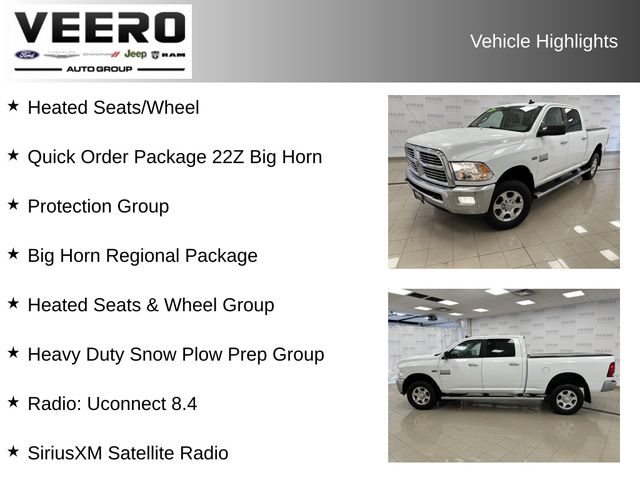 **1-Owner**Local Trade**Crew Cab**Bright White Clearcoat**Diesel Gray/Black Interior Seats**40/20/40 Premium Bench Seat**Remote Start**Heated Front Seats**Heated Steering Wheel**Heavy Duty Snow Plow Prep Group**Uconnect 8.4" Touchscreen Display, Power 10-Way Driver Seat, Front Dual Zone A/C, Backup Camera, SiriusXM Satellite Radio, Front/Rear Park-Assist System, Big Horn Regional Package, Media Hub (2 USB, AUX), Protection Group, Quick Order Package 22Z Big Horn, Wheels: 18" x 8.0" Polished Aluminum.
