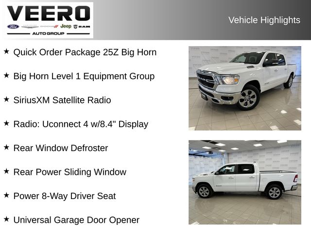 Exterior-wise, this Ram 1500 Big Horn/Lone Star stands out with its bold and distinctive styling. The white paint finish is complemented by chrome accents and 18-inch cast-aluminum wheels, giving it a refined and confident appearance. And with features like the rear power sliding window and universal garage door opener, you'll enjoy added convenience and versatility.