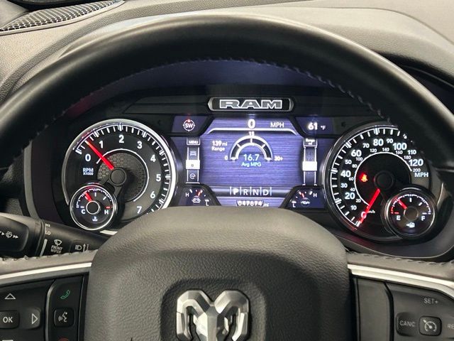 The exterior of this Ram 1500 is sleek and stylish, with a Black exterior color and chrome accents that give it a premium look. The 20-inch chrome-clad wheels and protective skid plates add to its rugged appeal.