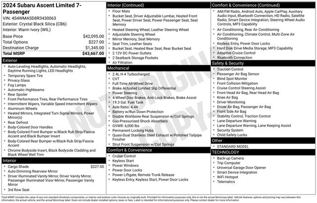 Veero Ford & CDJR of Morris is very proud to offer this good-looking 2024 Subaru Ascent Limited in Crystal Black Silica, beautifully equipped with Standard Model, 3rd row seats: bench, 4-Wheel Disc Brakes, 6 Speakers, ABS brakes, Air Conditioning, Alloy wheels, AM/FM radio: SiriusXM, Auto High-beam Headlights, Auto-dimming Rear-View mirror, Automatic temperature control, Axle Ratio: 4.44, Brake assist, Bumpers: body-color, Cargo Cover, Compass, Delay-off headlights, Driver door bin, Driver vanity mirror, Dual front impact airbags, Dual front side impact airbags, Electronic Stability Control, Emergency communication system: STARLINK Safety and Security (Subscription Required), Exterior Parking Camera Rear, Four wheel independent suspension, Front anti-roll bar, Front Bucket Seats, Front Center Armrest, Front dual zone A/C, Front fog lights, Front reading lights, Fully automatic headlights, Garage door transmitter: HomeLink, Heated door mirrors, Heated Front Bucket Seats, Heated front seats, Heated rear seats, Heated steering wheel, HVAC memory, Illuminated entry, Knee airbag, Leather Shift Knob, Leather steering wheel, Low tire pressure warning, Memory seat, Occupant sensing airbag, Outside temperature display, Overhead airbag, Overhead console, Panic alarm, Passenger door bin, Passenger vanity mirror, Perforated Leather-Trimmed Upholstery, Power door mirrors, Power driver seat, Power Liftgate, Power passenger seat, Power steering, Power windows, Radio data system, Radio: Subaru STARLINK 11.6" Multimedia Plus System, Rear air conditioning, Rear anti-roll bar, Rear reading lights, Rear window defroster, Rear window wiper, Reclining 3rd row seat, Remote Keyless Entry, Security system, Speed control, Speed-sensing steering, Split folding rear seat, Spoiler, STARLINK/Apple CarPlay/Android Auto, Steering wheel mounted audio controls, Tachometer, Telescoping steering wheel, Tilt steering wheel, Traction control, Trip computer, Turn signal indicator mirrors, Variably intermittent wipers, and Wheels: 20" x 7.5 J Dk Gray Alloy w/Machine Finish. Sales Tax, Title, License Fee, Registration Fee, $350 Dealer Documentary Fee, Finance Charges and Emission Testing Fees (if applicable) are additional to the advertised price. Check out the rest of the features on this vehicle. Standard Model, 3rd row seats: bench, 4-Wheel Disc Brakes, 6 Speakers, ABS brakes, Air Conditioning, Alloy wheels, AM/FM radio: SiriusXM, Auto High-beam Headlights, Auto-dimming Rear-View mirror, Automatic temperature control, Axle Ratio: 4.44, Brake assist, Bumpers: body-color, Cargo Cover, Compass, Delay-off headlights, Driver door bin, Driver vanity mirror, Dual front impact airbags, Dual front side impact airbags, Electronic Stability Control, Emergency communication system: STARLINK Safety and Security (Subscription Required), Exterior Parking Camera Rear, Four wheel independent suspension, Front anti-roll bar, Front Bucket Seats, Front Center Armrest, Front dual zone A/C, Front fog lights, Front reading lights, Fully automatic headlights, Garage door transmitter: HomeLink, Heated door mirrors, Heated Front Bucket Seats, Heated front seats, Heated rear seats, Heated steering wheel, HVAC memory, Illuminated entry, Knee airbag, Leather Shift Knob, Leather steering wheel, Low tire pressure warning, Memory seat, Occupant sensing airbag, Outside temperature display, Overhead airbag, Overhead console, Panic alarm, Passenger door bin, Passenger vanity mirror, Perforated Leather-Trimmed Upholstery, Power door mirrors, Power driver seat, Power Liftgate, Power passenger seat, Power steering, Power windows, Radio data system, Radio: Subaru STARLINK 11.6" Multimedia Plus System, Rear air conditioning, Rear anti-roll bar, Rear reading lights, Rear window defroster, Rear window wiper, Reclining 3rd row seat, Remote Keyless Entry, Security system, Speed control, Speed-sensing steering, Split folding rear seat, Spoiler, STARLINK/Apple CarPlay/Android Auto, St