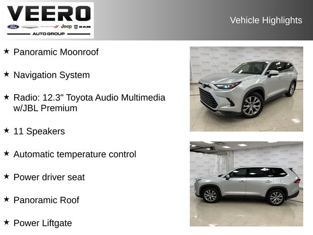 **Clean CARFAX**1-Owner**Panoramic Moonroof**Heated/Ventilated Leather Front Seats**Heated Rear Seats**Heated Steering Wheel**Navigation**Hands-Free Power Liftgate**Blind Spot Monitor**3rd Row Seating (Seats 7), Power Driver Seat, Wireless Phone Charger, 12.3" Toyota Audio Multimedia w/JBL Premium, 11 Speakers, Tri-Zone Automatic Climate Control, Rain-Sensing Wipers, Front & Rear Parking Assist, Apple CarPlay/Android Auto, Backup Camera, Wheels: 20" Aluminum Alloy.